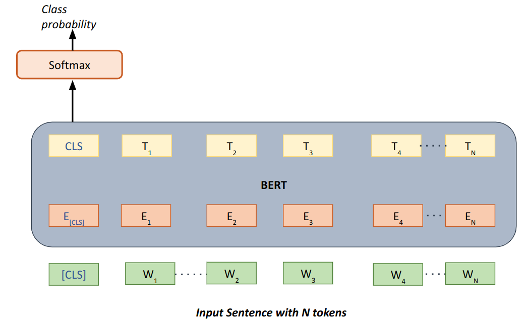 Fine-tuning text classification generally involves feeding complete input text into the transformer model and pooling/aggregating the transformer output in some way before forwarding the output to feed forward layers which can perform classification. The input text may also contain special tokens if necessary to provide special meaning to some parts of the text, like assigning a special token after every sentence in a paragraph. The below diagram summarizes the same approach where input sentence is fed and embeddings for the whole input sentence is extracted and aggregated from the first [CLS] special token.
